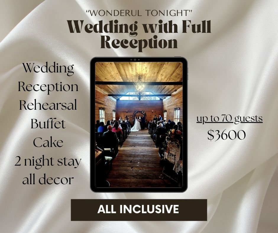 Includes chapel or outdoor ceremony, limited photos sent to your phone, color choice for décor, wedding favors, coordinator, speaker, minister, water table, and up to 3 hours in our bridal barn. Extra hours can be purchased.
